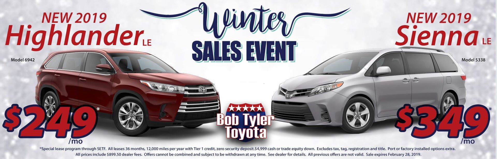 2019 Toyota Highlander LE Lease Special. Lease for $259/mo for 36 months! *plus tax, tag, and $210 doc fee. $2,999 due at signing. 10,000 miles per year. 0.15 mileage penalty. With approved Credit. No security deposit required. see dealer for details. Expires 4/1/2019. ... Read Content